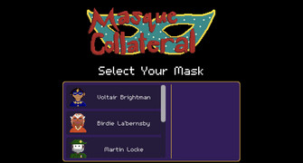 Masque Collateral parodies the high luxury of the Gilded Age and the absurdity of the hyper-rich. Hugh Bris is a young man seeking revenge, and having infiltrated the Unmasquerade Ball, seeks the one responsible for his family's demise. Using your incredible talent for dance, keep your score high to avoid getting kicked out of the party before you can enact your revenge!